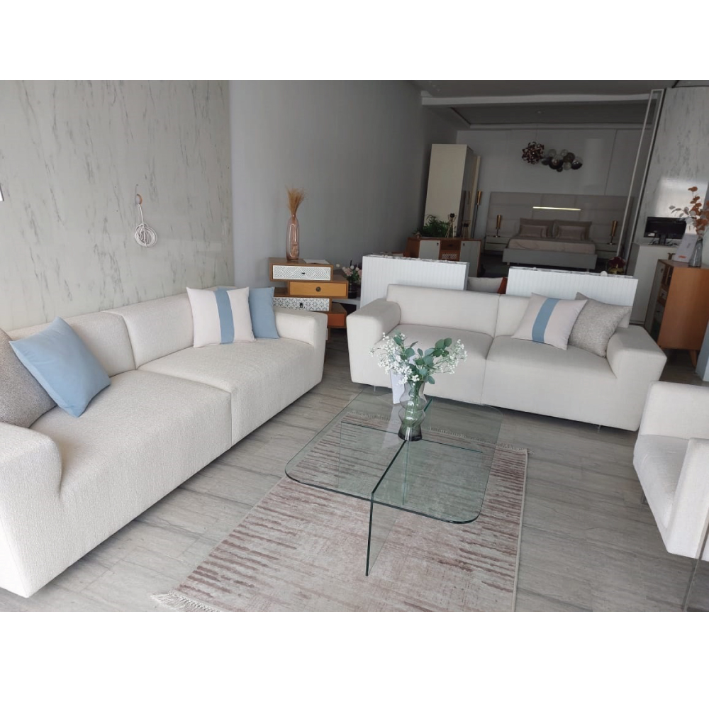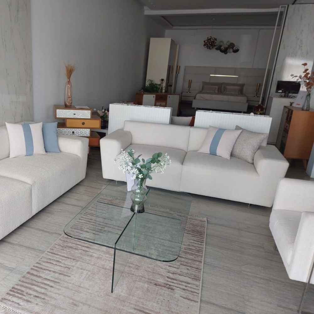 Salon oscar 2 canapé 260 cm sur 220 cm tissu bouclette socle en inox